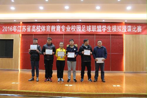 2016年12月30日,在我校举办的江苏省体育教育足球联盟模拟授课比赛中,共有来自江苏省11所本科院校和5所专科院校代表参赛,每个学校两名代表,比赛时间从上午八点到下午六点,采用了抽签选题的比赛形式,在紧张的比赛过程中,我院选手朱琳娜、戴志盛同学以生动的教学语言、得体的教学仪态、灵活的应对技能,充分展示了我院学子扎实的专业技能和临场授课能力,获得了评委老师的一致好评,分别获得一等奖第一名和第二名。