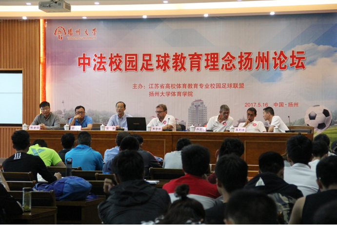 论坛由江苏省高校体育教育专业校园足球联盟和扬州大学体育学院共同主办,我院承办。来自法国蒙彼利埃大学教授、欧足联A级教练员、江苏省高校体育教育专业的足球专业教师、体育学院足球专项学生以及我院师生代表近100人参加论坛。