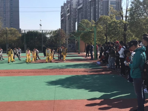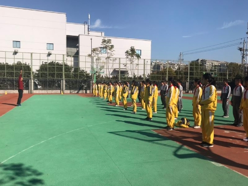 上午10点我院师生准时抵达梅岭中学篮球场观摩此次公开课,付善伟老师一声哨响全班同学身着统一服装以饱满的精神面貌成四列队伍迅速集合完毕。