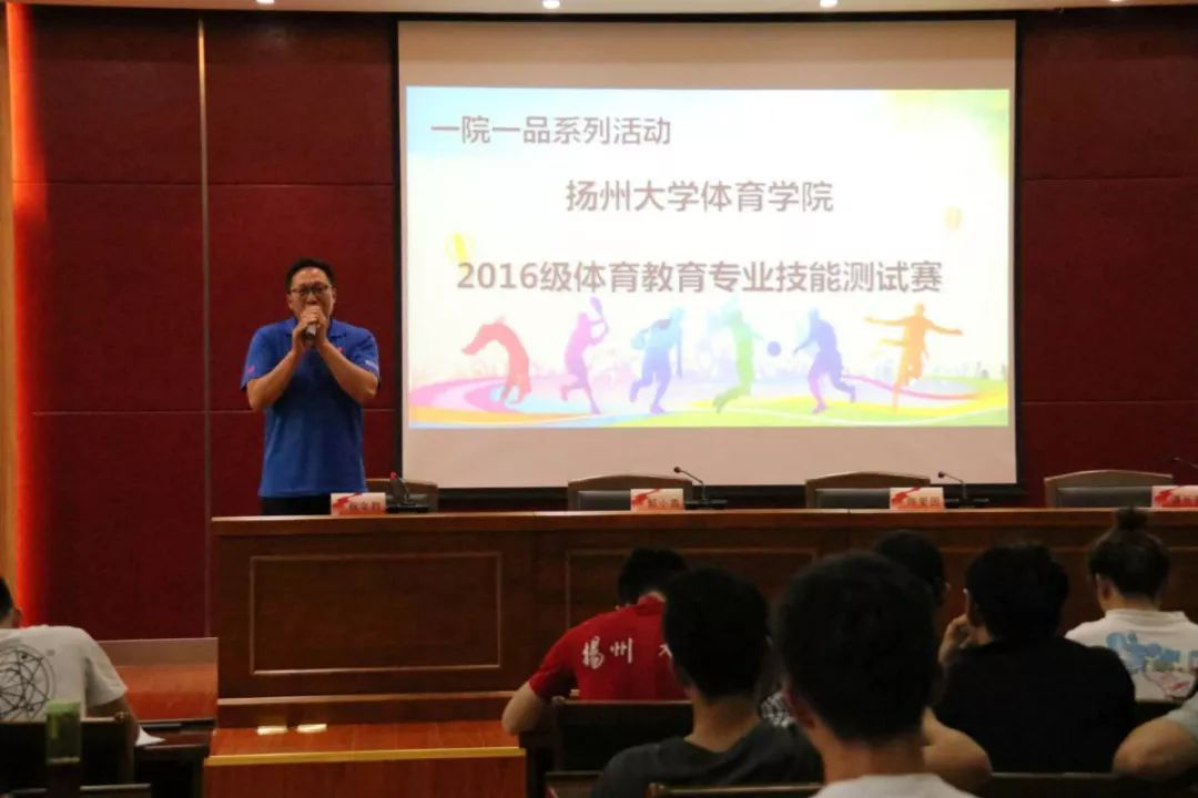 在开幕式上,在开幕式上,副院长陈爱国老师介绍了本次技能测试赛的目的和我院在历年江苏省师范生大赛中取得的优异成绩,分析了我院体育教育专业目前的发展形势以及未来的发展方向,勉励在场学生要培养责任与担当意识,为了学院的荣誉、为了自己的发展,苦练专业基本功,夯实基础。