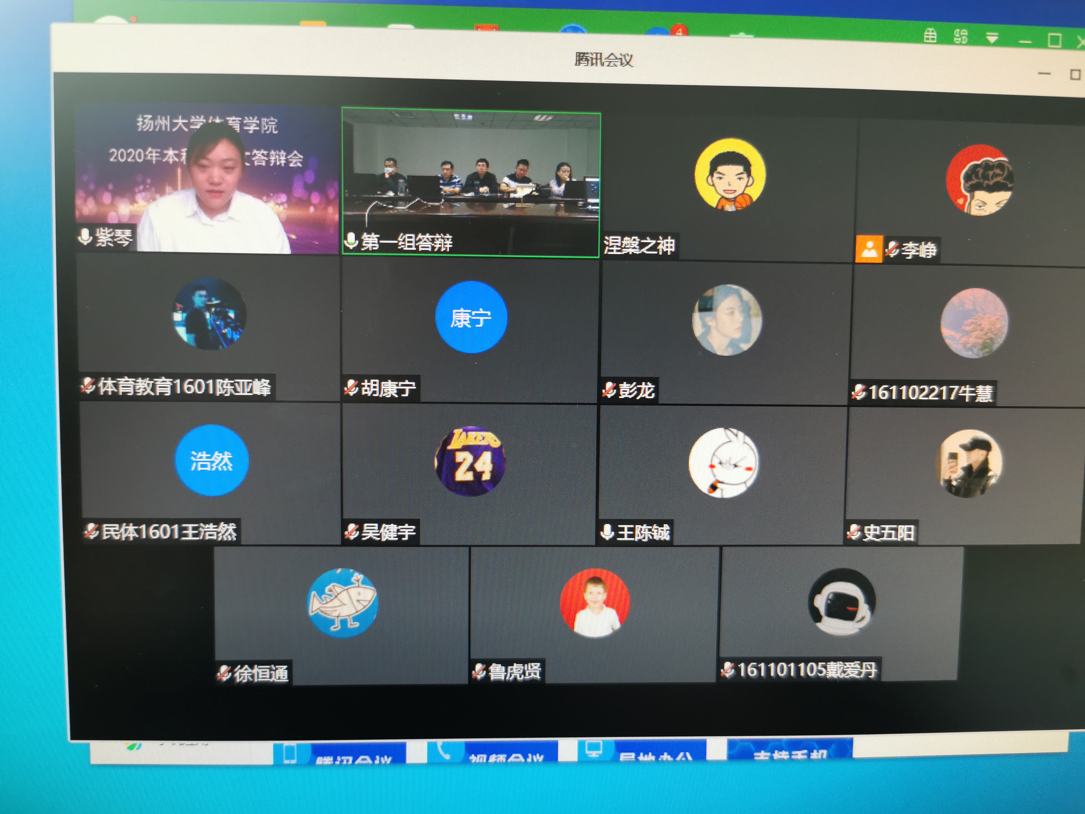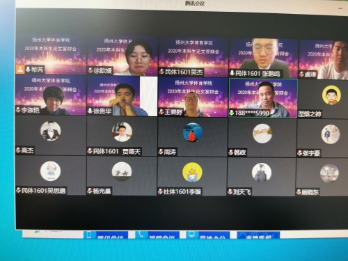 受新冠肺炎疫情影响,遵照扬州大学疫情防控要求,结合学校《关于做好2020届本科生毕业设计(论文)评阅答辩及评优工作的通知》的相关规定,6月9日-6月10日, 我院举办了2020届毕业生论文线上答辩会。本次线上答辩分为12个答辩小组,每个答辩专家组成员有5位老师,共有157位毕业生参加了答辩。参加此次答辩会的有球类教研室主任高宝龙老师、体育教研室主任陈辉映老师以及各教研室的老师。
