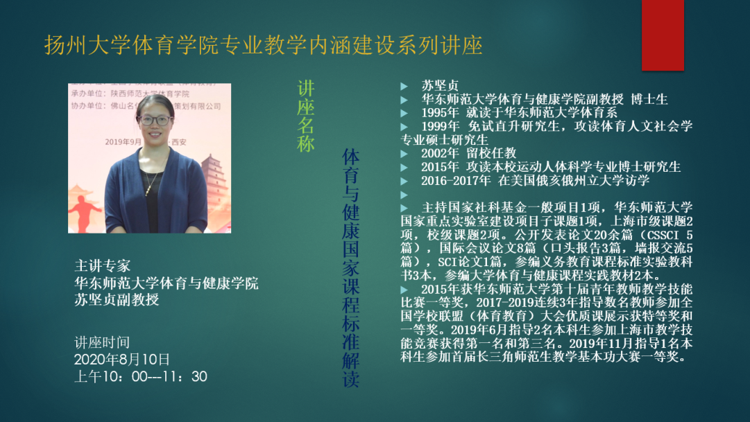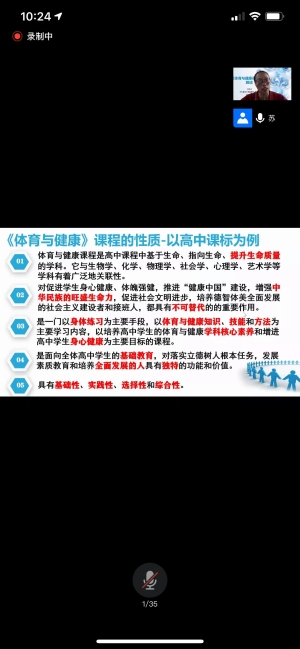 第一场讲座邀请到了来自上海华东师范大学体育与健康学院苏坚贞教授主讲,苏教授通过网络直播作了题为“体育与健康国家课程标准解读”的学术报告,讲座由我院副院长王秋林老师主持,17级所有的同学通过网络聆听了此次讲座。
