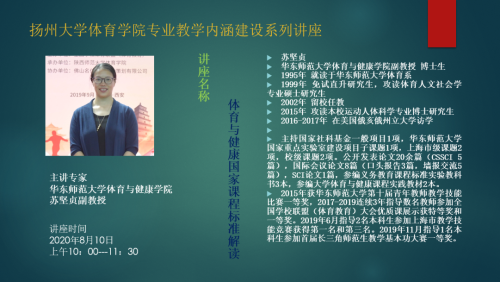 8月10日上午午,扬州大学体育学院专业教学内涵建设系列讲座正式启动。本次系列讲座活动全程运用腾讯会议的形式在线上举行。学院邀请了分别来自上海高校和扬州本地6位知名专家、教授进行主讲。整个系列讲座在8月20日前完成。