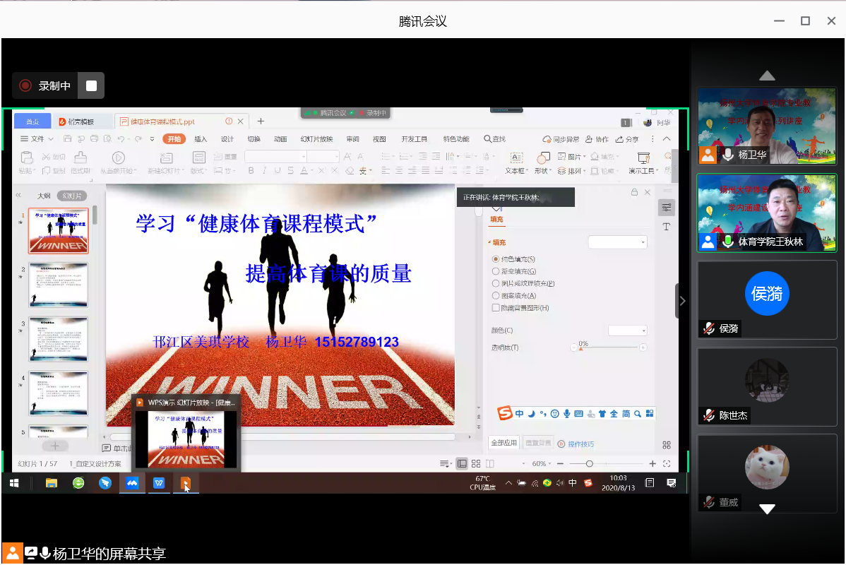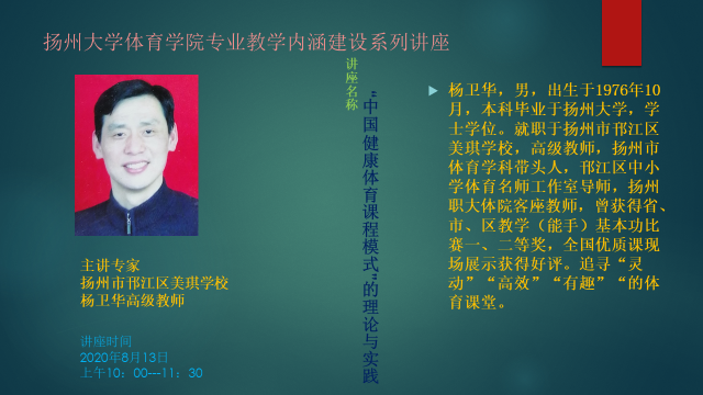 8月13日上午,扬州大学体育学院举办了专业教学内涵建设系列讲座的第四场讲座,本场讲座邀请到了高级教师、邗江区美琪学校的杨卫华老师作为主讲人。杨老师借助腾讯网络会议平台,为同学们带来了题为“学习‘健康体育课程模式’提高体育课的质量”的报告。本场讲座由体育学院副院长王秋林老师主持,体育学院全体2017级学生聆听了本次讲座。