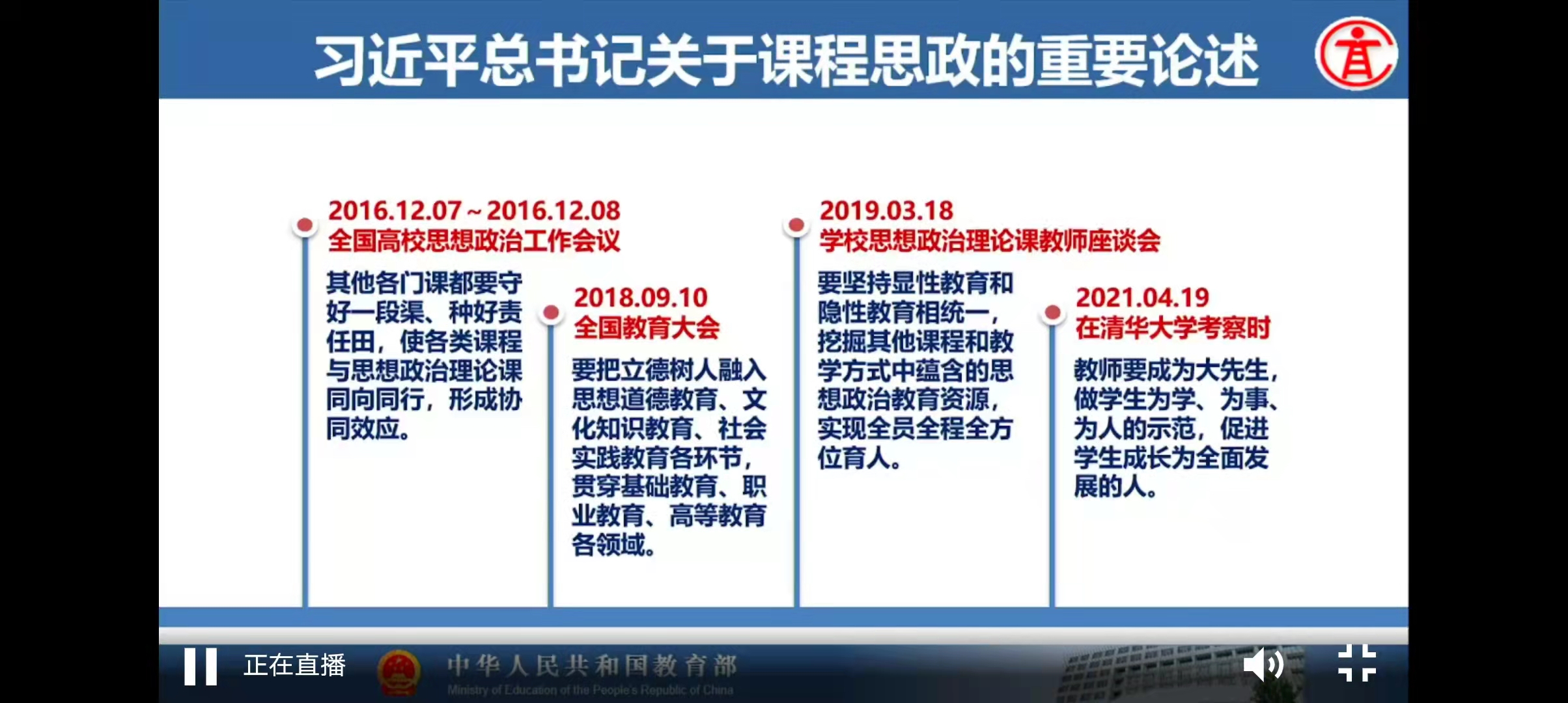 为深入落实《高等学校课程思政建设指导纲要》,提升高校教师的课程思政教学能力,11月24日下午至26日上午,教育部高等教育司组织了为期2天的高校教师课程思政教学能力培训,我院组织40岁以下的专任教师参加了本次线上培训。