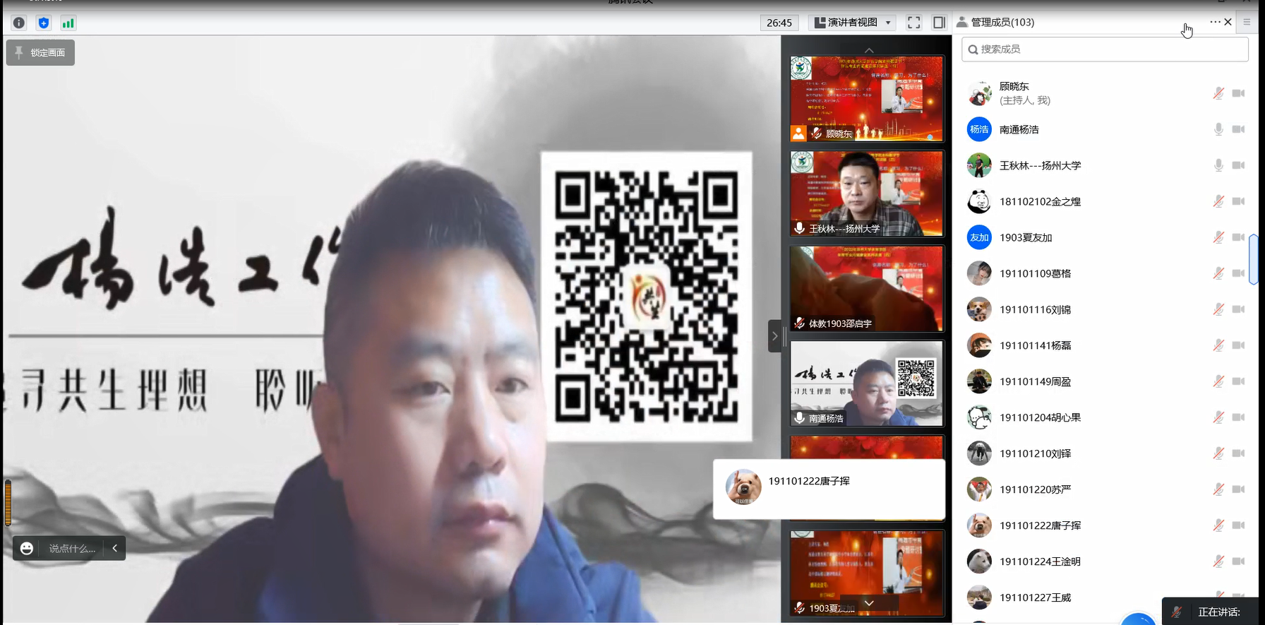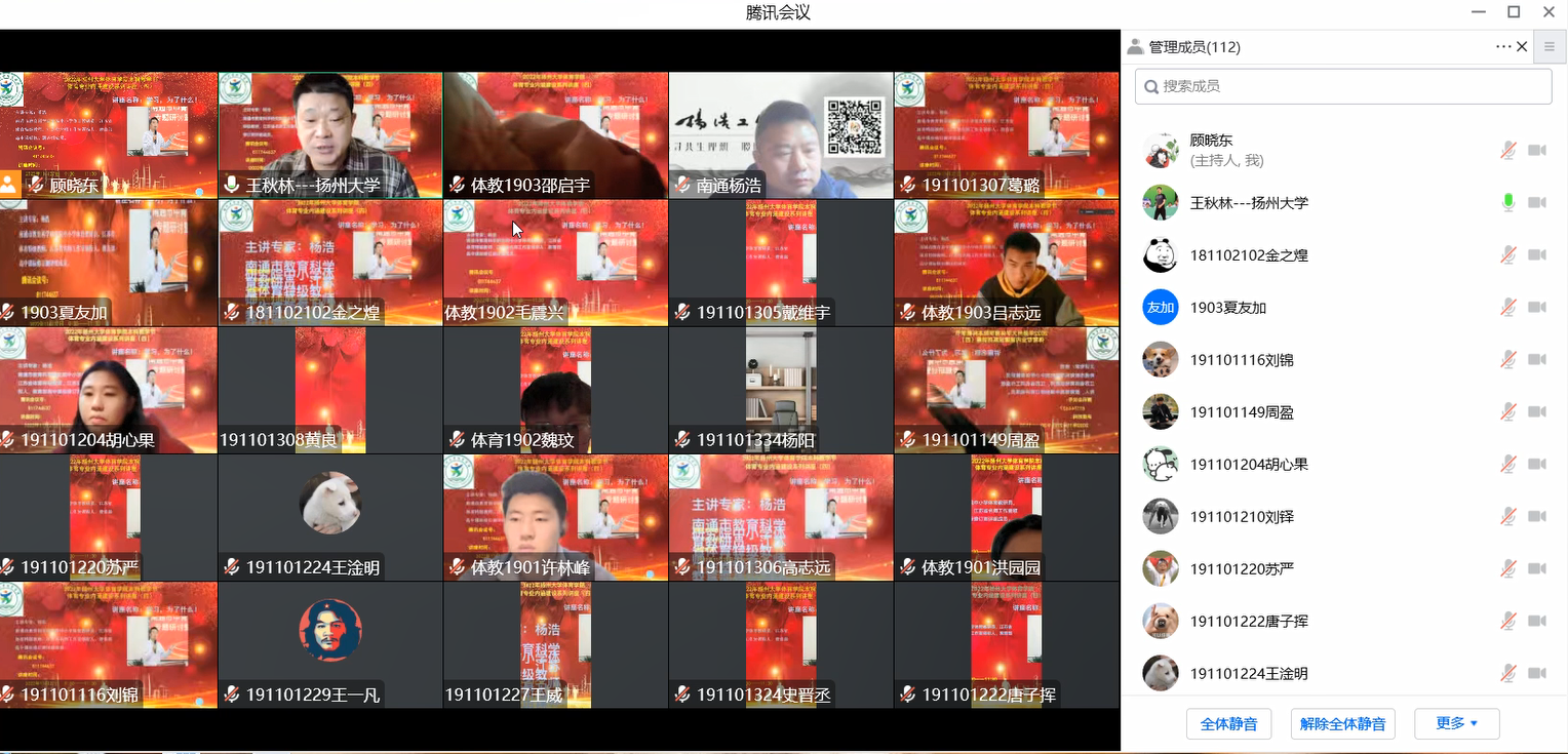 11月27日上午,我院举办了2022年扬州大学体育学院本科教学节体育专业内涵建设系列讲座的第四场讲座,本场讲座邀请到了南通市教育科学研究院中小学体育教研员、江苏省体育特级教师杨浩老师作为主讲人。杨浩老师借助腾讯网络会议平台,为同学们带来了题为《学习,为了什么!》的报告。本场讲座由体育学院副院长王秋林老师主持,体育学院体育教育专业主任陈辉映老师、社会体育管理与指导专业主任毛志晨老师、武术与民族传统体育专业主任徐贵华老师以及全体2019级学生聆听了本次讲座。