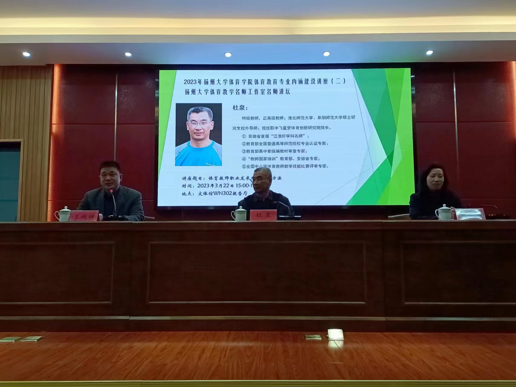 为提高我院师范生专业技能水平、提升毕业生综合素质,树立正确的体育教育评价观,进一步加快体育教育专业内涵建设的步伐,3月22日下午,我院在文体馆WN302报告厅举办了2023年“扬州大学体育学院体育教育专业内涵讲座(二)”暨“扬州大学体育教学名师工作室名师讲坛”,扬州大学教务处副处长、师范教育办公室余福丽老师,安徽省正高级教师、特级教师杜泉教授受邀参加了本次活动,学院副院长王秋林老师主持了讲座。杜泉教授做题为“体育教师职业发展的路径与方法”的报告,大四全体毕业生聆听了讲座。