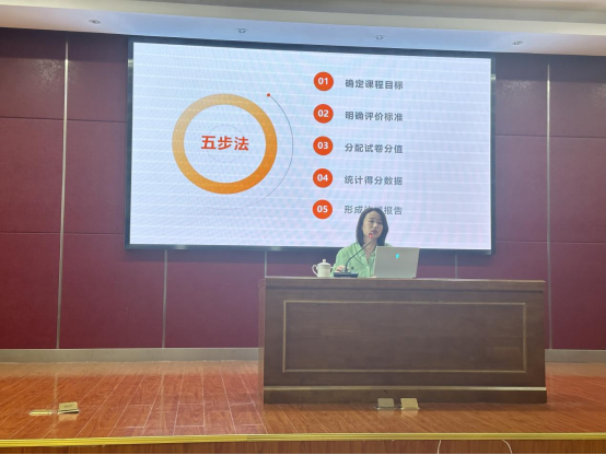 随后,体育人文教研室主任陈辉映从确定课程目标、明确评价标准、分配试卷分值、形成达成报告等五个方面结合体育教育师范专业认证工作对课程目标达成度计算方法进行了详细的讲解。与会者对课程目标达成度报告的撰写有了充分的认识,为更好的完成审核评估工作做好了准备。