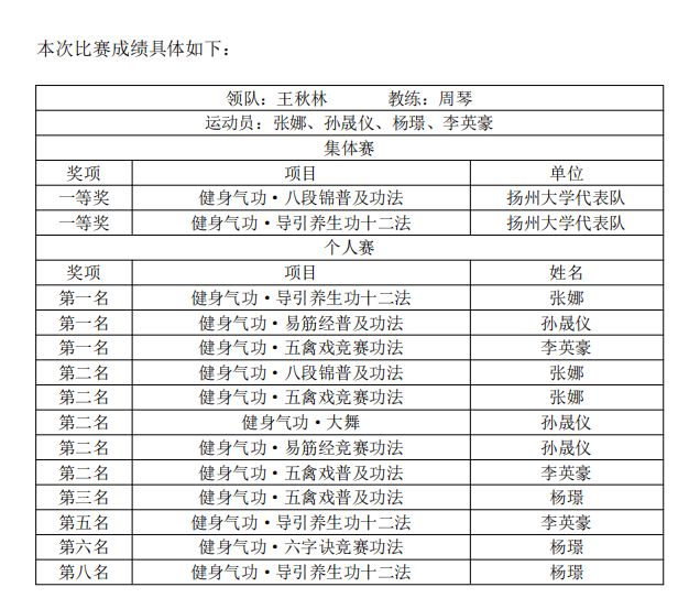 此次比赛的成功离不开同学们的刻苦训练,离不开我院教练团队的辛勤付出,更离不开学院领导的大力支持。在比赛中,扬州大学代表队展现出了高超的技术水平和出色的团队合作精神。他们经过长时间的训练和准备,充分展示了扬州大学在健身气功领域的实力和潜力,取得了集体赛2个一等奖、个人赛3个第一名、5个第二名、1个第三名的优异成绩。