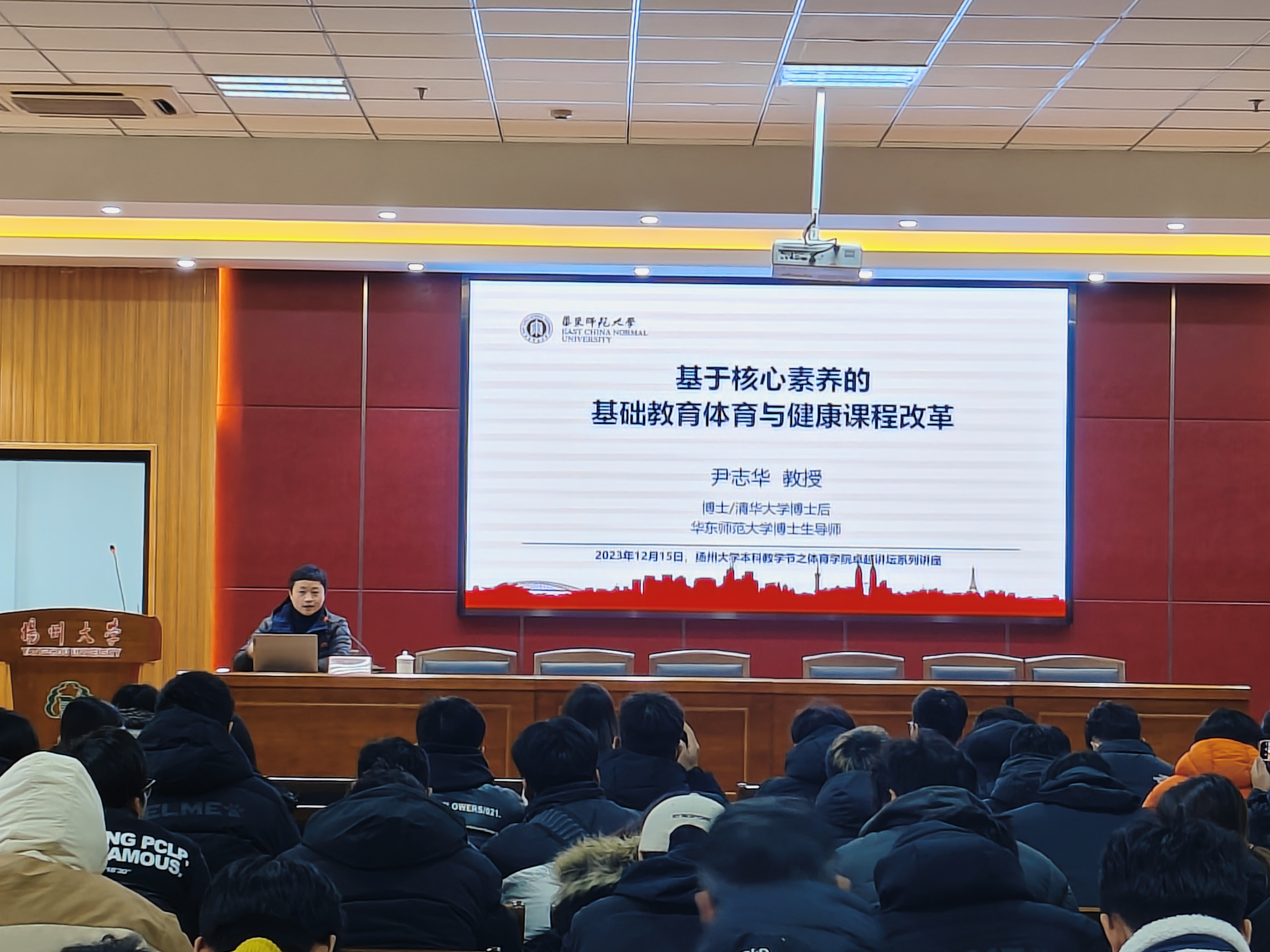 2023年12月15日,我院在文体馆WN302报告厅举办了扬州大学本科教学节之扬州大学体育教学名师工作室名师讲坛活动。华东师范大学博士生导师、清华大学博士后尹志华教授受邀主讲题为《基于核心素养的基础教育体育与健康课程改革》的学术讲座。本次讲座由体育学院体育教育专业部主任陈辉映老师主持,体育教育专业21级全体本科生及部分研究生和教师参加了本次讲座。