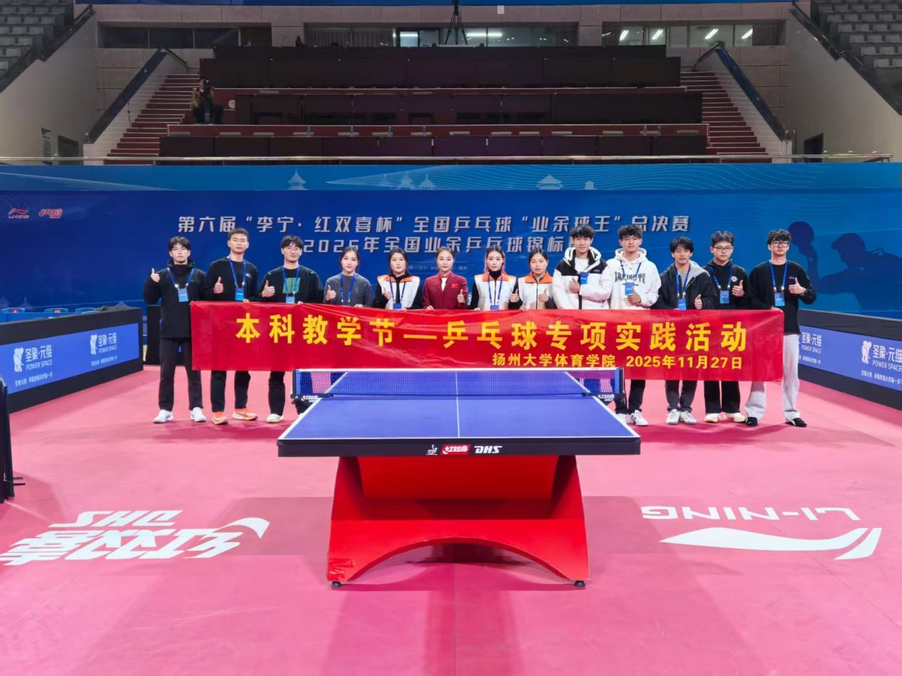 2025年11月27日至30日,由中国乒乓球协会主办的第六届“李宁·红双喜杯”全国业余乒乓球总决赛在扬州举办。受江苏省乒乓球协会商调,扬州大学体育学院乒乓球专项班的12名同学,在丁智超老师的带领下,以专项实践活动形式圆满完成了本次赛事志愿服务工作。将课堂所学运用于实战场景,实现了“学做融合、以赛促学”。