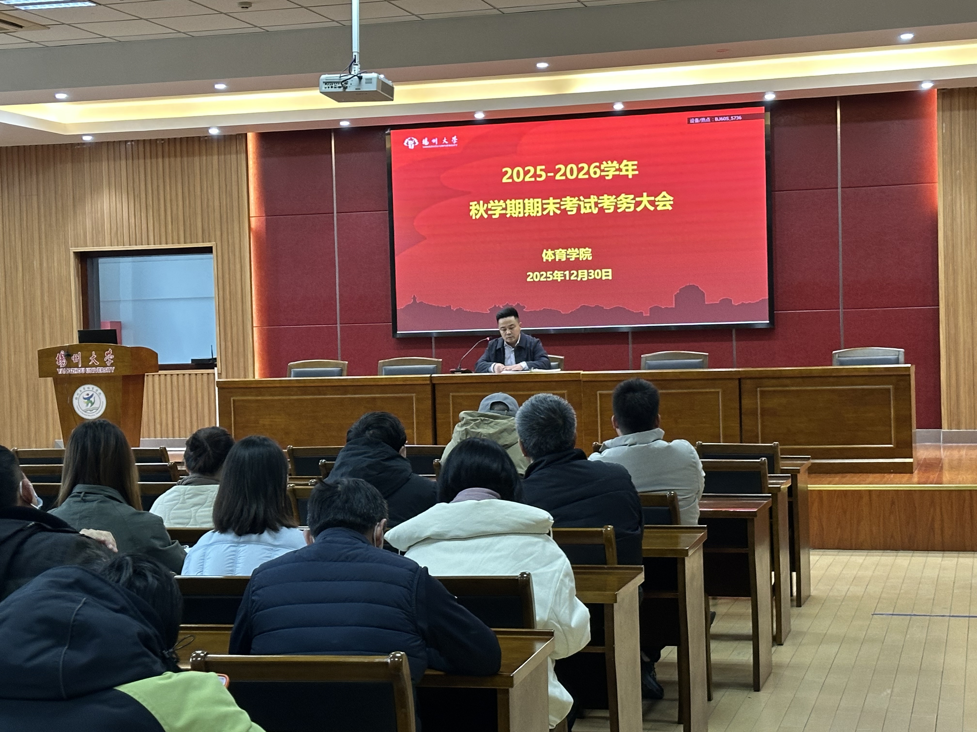 2025年12月30日,体育学院在扬州大学扬子津校区文体馆WN302报告厅召开2025-2026学年秋季学期期末考试考务大会。会议由体育学院副院长张银行主持,教学秘书、教务员及全体监考教师参加了会议。