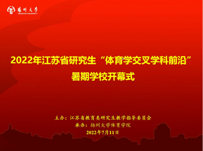 2022年江苏省研究生“体育学交叉学科前沿”暑期学校于2022年7月11上午举行线上开班仪式。参加开幕式的领导有扬州大学党委常委、副校长陈国宏教授,江苏省教育学类研究生教育指导委员会秘书长、南京师范大学教育科学学院副院长邵泽斌教授以及扬州大学研究生院王莉副院长等。出席本次暑假学校开幕式的还有来自全国40余所高等学校、体育院系、科研机构的博士、硕士研究生140余名学员。本次暑期学校由江苏省教育类研究生教学指导委员会主办;扬州大学体育学院承办。