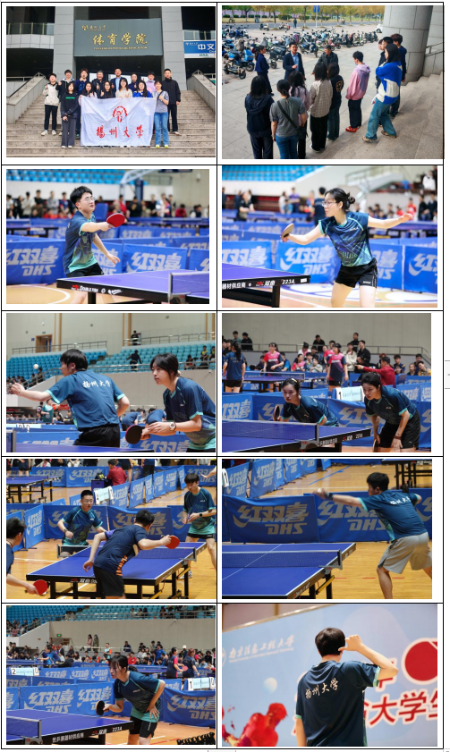 我校代表队由体育学院副院长王秋林担任领队,张新、丁智超2位老师担任教练,带领来自医学院、商学院等8个学院的11名非体育专业大学生陈宇霖、龙柏淳、邓皓淼、周若宇、王永熙、毕淑婉、赵均祎、孟瑀婕、李文迪、刘笑寒、单金珠参加此次比赛,其中有6名本科生和5名研究生。经过激烈的角逐,我校来自数科院的邓皓淼同学获得男子单打第七名,商学院的毕淑婉同学获得女子单打第八名,同时我校在混合团体项目近40支队伍中位列前16名。这是我校首次参加江苏省大学生普通生组乒乓球锦标赛,全体师生克服集训时间短、参赛经验少、各专业同学每天跨校区参加集训等重重困难,顺利完成本次比赛任务,为我校争得荣誉。