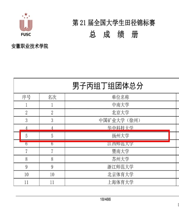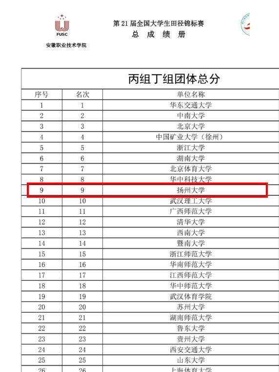 我校代表队由体育学院(体育工作部)副院长(副主任)傅建担任领队,校田径高水平运动队郝晓帆、张欢、张俊3位教练员,刘俊茜、池宣、张赛等18名体育学院学生组成,参加了丙丁组比赛,获得2金1铜,破1项赛会记录,其他前八名成绩13项。丙丁组共124个参赛学校中,我校荣获男子团体第5、男女团体第9的佳绩。