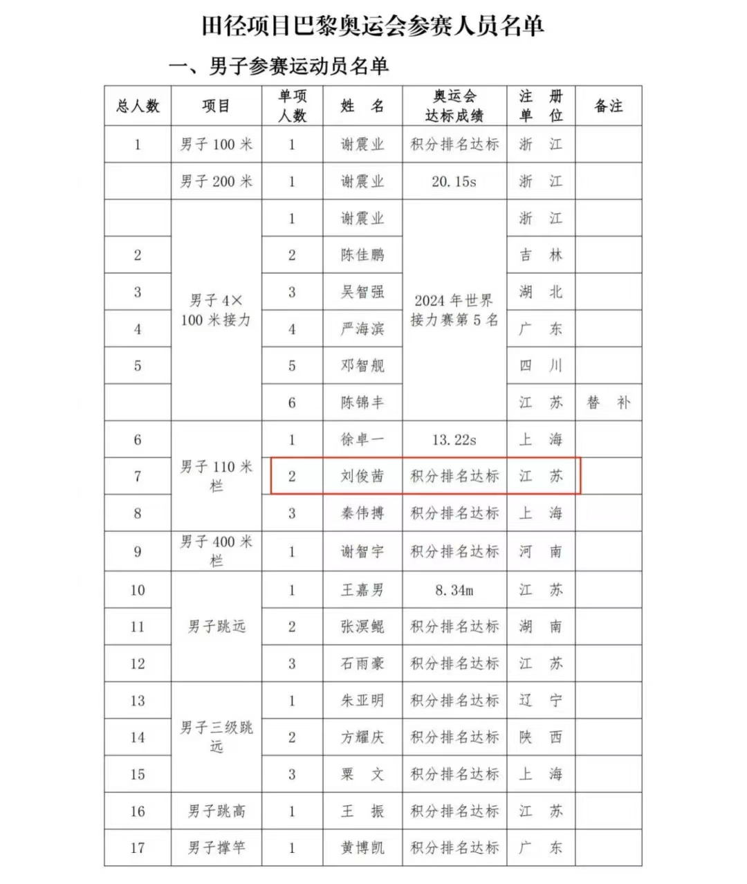 2024年7月4日,中国田径协会官网正式公布了田径项目2024年巴黎奥运会参赛人员名单。我校刘俊茜成功入围男子110米栏项目!