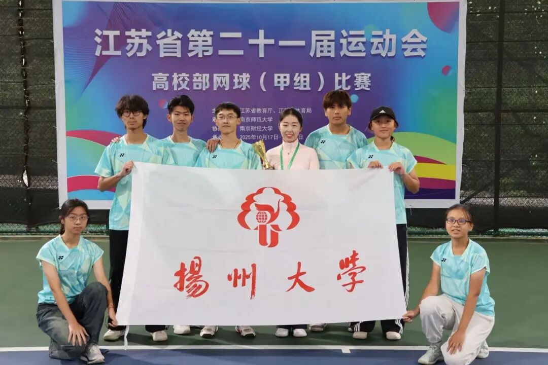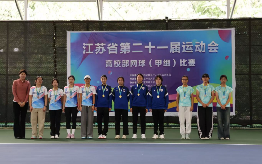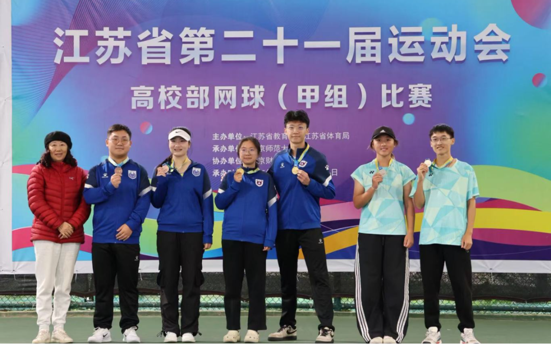 由江苏省教育厅、江苏省体育局主办的江苏省第二十一届运动会高校部比赛于10月17日开赛,比赛预计从2025年9月开始,持续至2026年10月结束。网球甲B组(本科院校普通组)是高校组首场比赛,于2025年10月17日-22日在南京财经大学仙林校区进行,全省共有27所本科院校参加该组别比赛。我校首次组建非体育专业学生网球队参加省运会比赛。经过五天的激烈争夺,在与众多强校的较量中脱颖而出,斩获女子团体亚军、混合双打亚军、男子团体第六名、女子单打第八名,团体总分第五的佳绩。