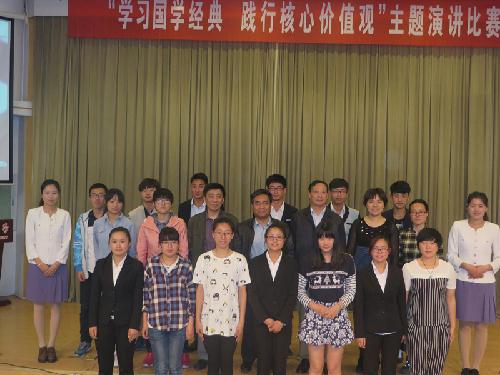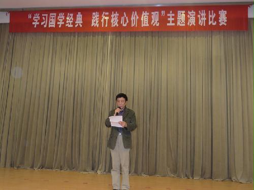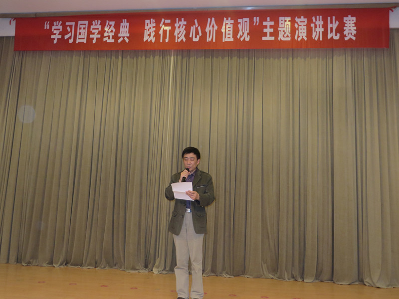 2015年5月6日晚,体育学院在中心校区图书馆逸夫报告厅举行了“学习国学经典,践行核心价值观”主题演讲比赛。院党委刘煜书记、文学院刘勇刚教授、院团委陈志艳书记和院研究生教学秘书陈芳老师出席活动并担任评委。参加此次比赛的同学共有11名。他们分别用演讲和PPT的方式来阐述他们心中的“弟子规”。