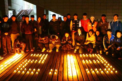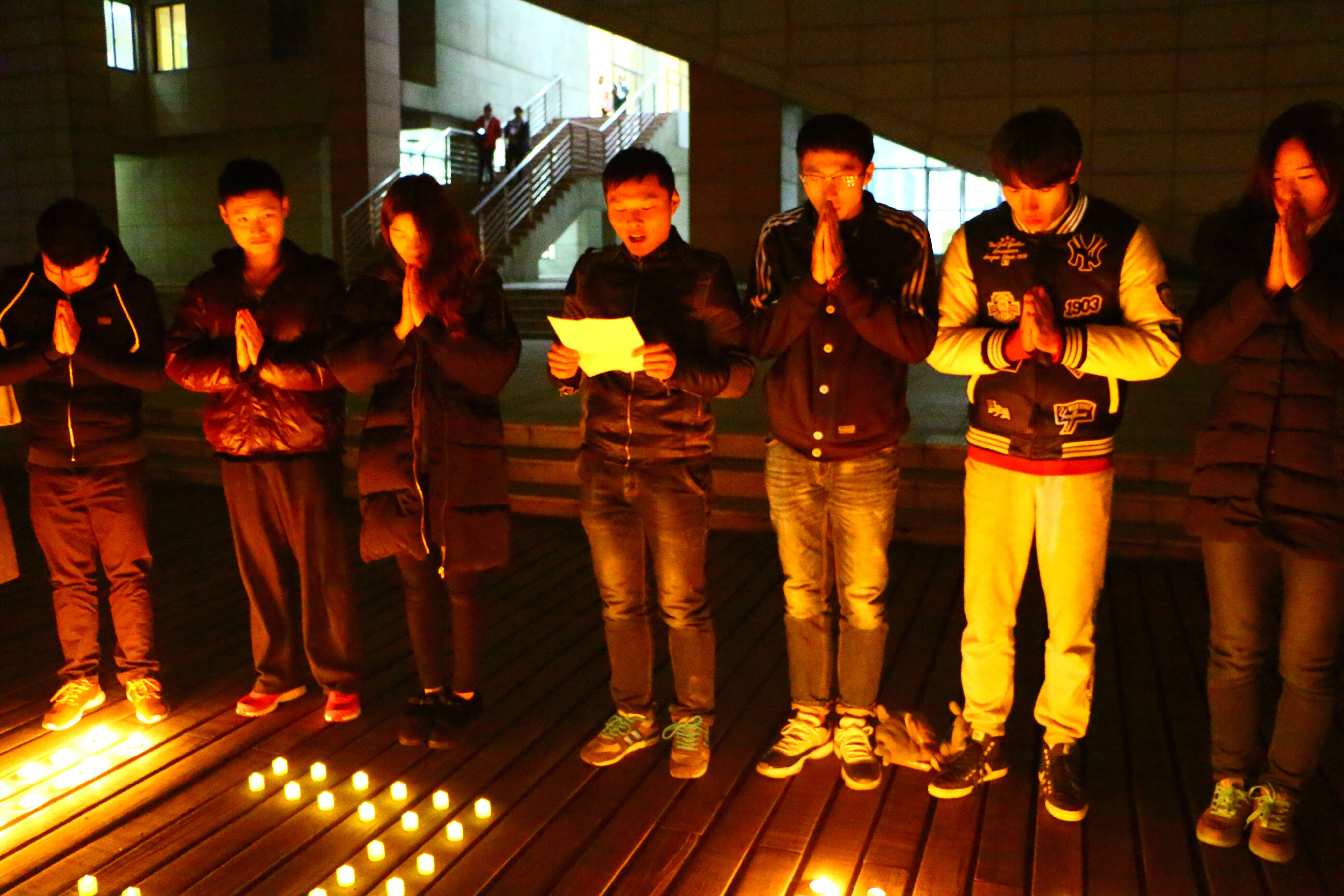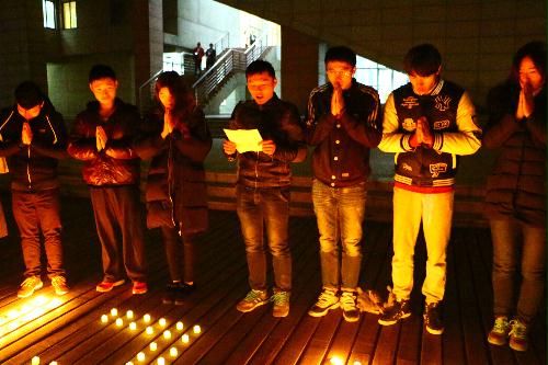 发言结束之后,在场所有同学绕着“12.13”字样的蜡烛围成一个圈,一起默哀三分钟,以表达对死难同胞的悼念。