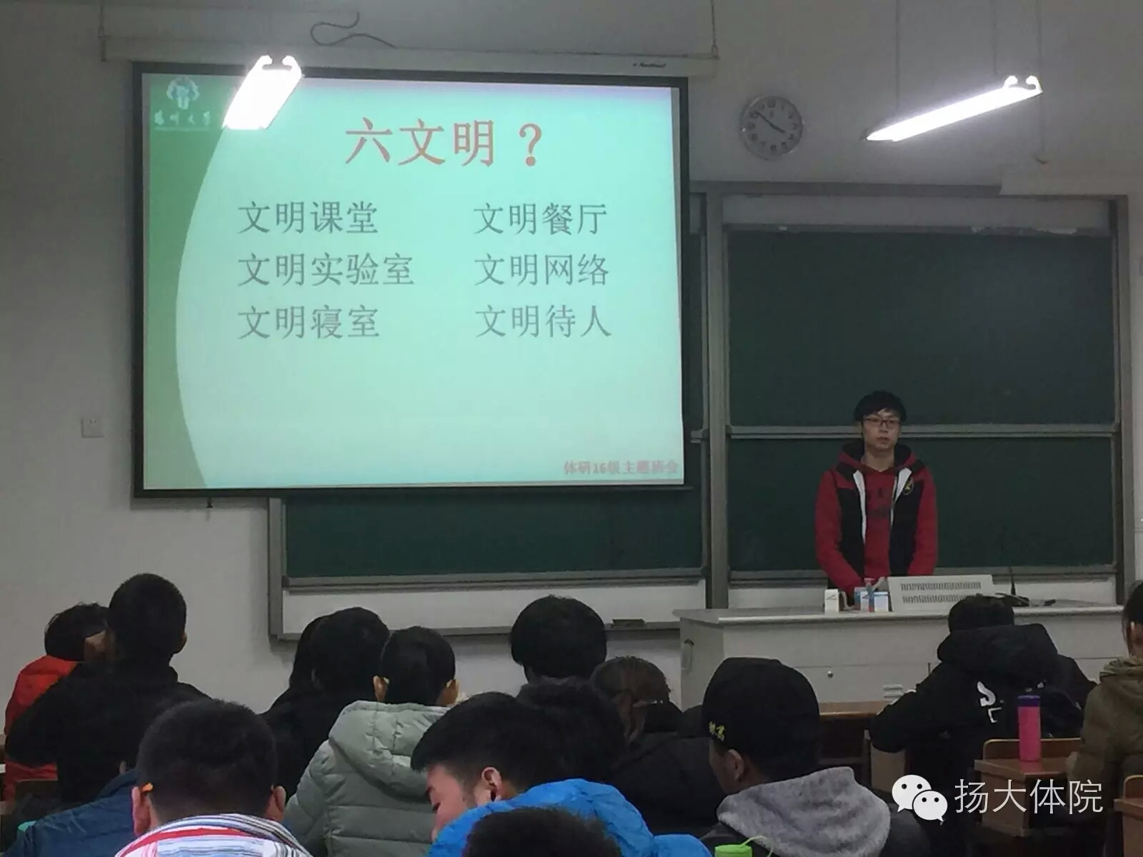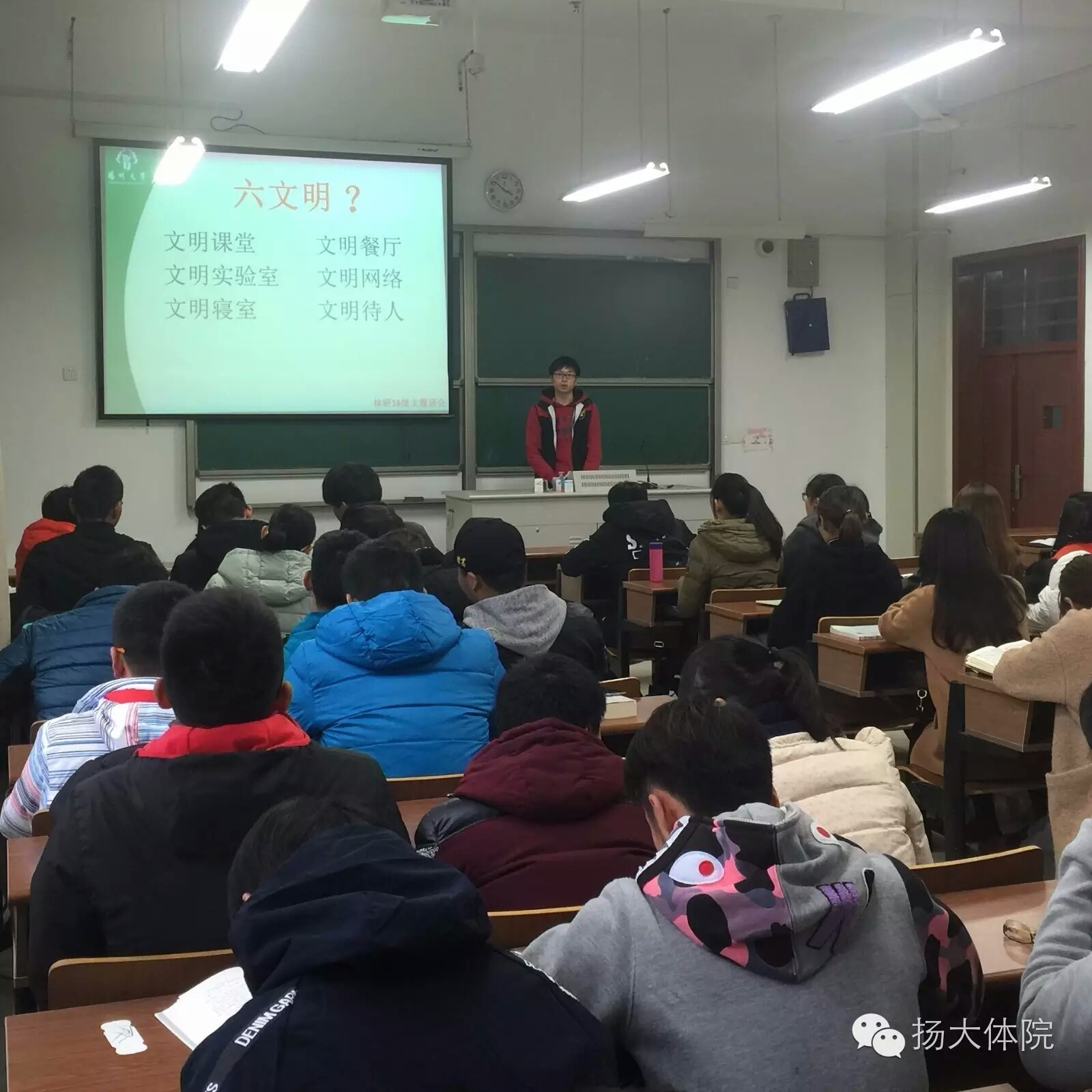 为切实加强学生基础文明建设工作,积极营造积极、健康、文明、和谐的育人氛围,引导学生提高文明意识和养成文明行为习惯,全面提高学生文明素质。11月25日,体育学院研一师生就“六文明”展开系列主题讨论活动。在学院书记、班主任老师和班级学生干部的组织下,我院体研14、15、16级研究生共154人,非毕业班同学分别以班级为单位举行了“六个文明”的主题班会,毕业班同学开展线上与线下相结合的形式,通过“两微一端”的推送,学习贯彻落实“六个文明”精神,引导毕业班学生把思想和行动统一到精神上来。