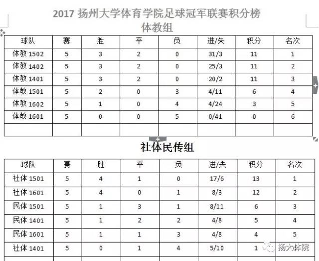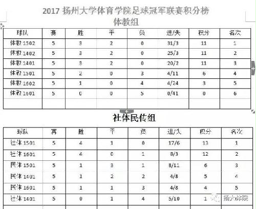 1、2017扬州大学体育学院足球冠军联赛积分榜