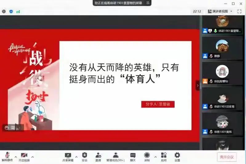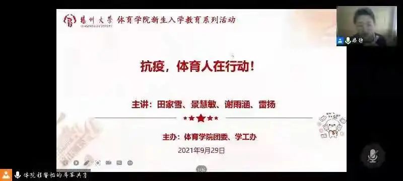 为进一步弘扬抗疫精神,传承和发展爱国主义、集体主义精神,向全体新生展示我院师生于疫情面前临危不乱的精神风貌,9月29日下午,我院于线上举行了主题为“抗疫,体育人在行动”的入学教育系列云端活动。出席本次会议的有院团委书记滕静老师、体研1901班景慧敏同学、体育1801班雷扬同学、体育1902班谢雨涵同学、体研1901班田家雪同学以及2021级全体本科新生。本次会议由体研2001班程馨怡同学主持。