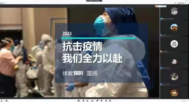 随后,体研1901班景慧敏的同学向大家展示了疫情封于校内,作为抗疫志愿者的生活日常。她始终以习近平总书记“打赢疫情防控这场人民战争,必须紧紧依靠人民群众”的这一要求为方向,坚持做一个“挺身而出的体育人”。