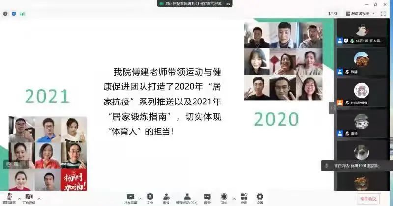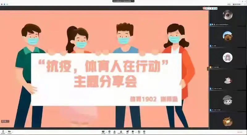 会议伊始,体研1901班的田家雪同学结合自身经历,从“疫情下,体育能承担什么”、“居家抗疫系列推送”、“居家锻炼指南”等几个方面向大家诠释了何为“体育人的担当”。并向大家提出了“立方案、问题简单化、主动成大器、发挥所长”几点倡议。
