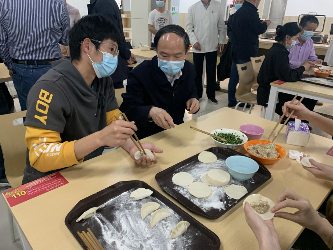 校党委书记焦新安、副校长陈国宏与同学们一共包饺子,活动间亲切与学生们交流,并与同学们亲切交流,“家里面是哪里的?”“生活上有遇到什么困难吗?”“口罩等防疫物资够吗?”等了解学生学习、生活情况,送去学校的亲切问候。同学们纷纷表示,学校的疫情防控工作做得十分扎实,校园文化生活丰富多彩,特殊时期感谢学校领导关怀。焦书记寄语同学:艰苦自立精神的培养也与辛勤劳动密不可分。作为扬大学子,应当勤勉刻苦、务实笃行,以劳动为荣,培养劳动意识,提高劳动能力,在人生奋斗路上挥洒青春的汗水。