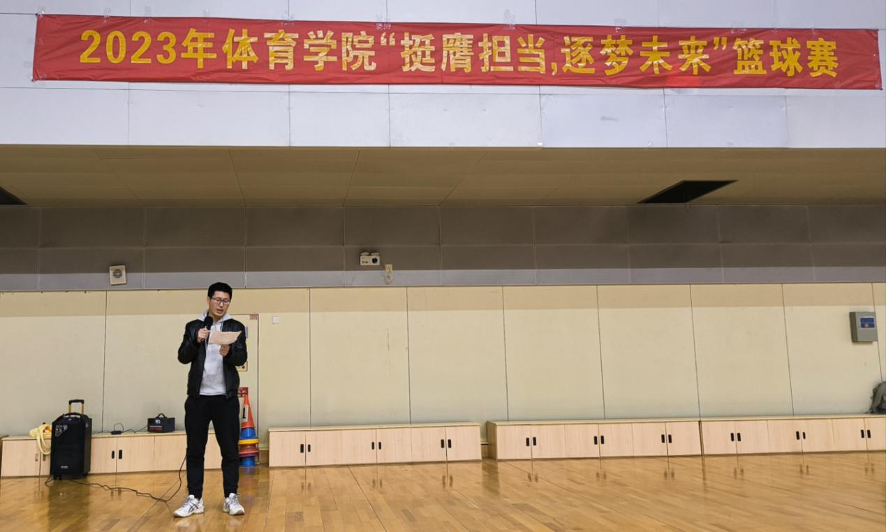 3月26日下午,学院于文体馆二楼篮球馆举行了“挺膺担当,逐梦未来”篮球联赛开幕式。本届篮球赛由学院团委、学工办主办,学院学生会、学院社团联合会承办。开幕式开始由仲飞成老师发表讲话,随后进行的是裁判员代表宣誓及运动员代表宣誓。