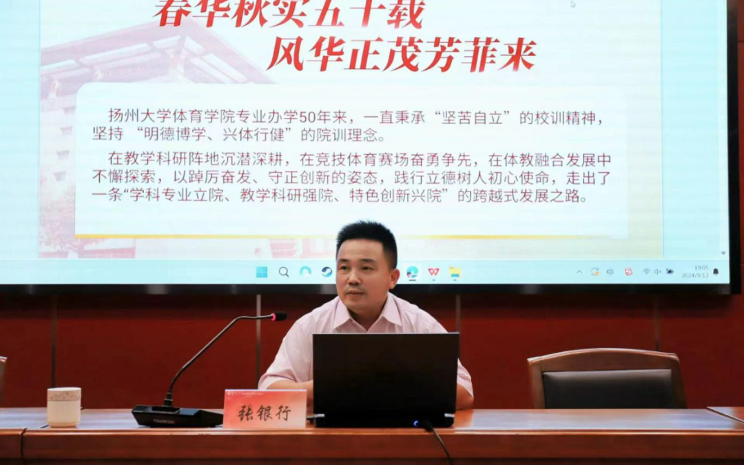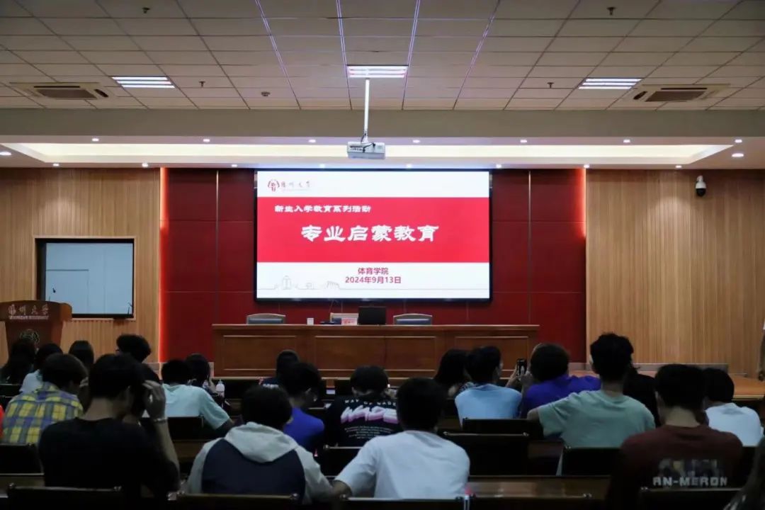 张银行从“明德博学,兴体行健”的院训出发,向新生讲述我院50多年的发展历史,并带领新生回顾我院诸多杰出校友和荣誉。他围绕专业设置、培养目标、毕业就业、特色优势等方面为2024级新生进行详细讲解,有助于新生明确未来发展方向。随后他介绍了我院的师资力量、学科研究、人才基地,帮助同学们更加深入了解我院,为日后学习提供帮助。最后,张银行希望同学们坚定信念,热爱体育,围绕自己的目标去制定自己的生涯规划并为之不懈努力。
