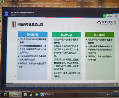 为进一步做好师范类专业认证工作,确保认证准备工作的有效开展,学院于3月25日利用腾讯会议室线上召开师范类专业认证视频培训会议。学院领导班子、专业部各教研室主任、教学秘书、教务员等相关人员参加了本次培训。