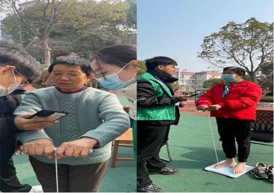 志愿者帮助老人测量心率、体脂率、内脏脂肪、骨盐含量、BMI、身体代谢