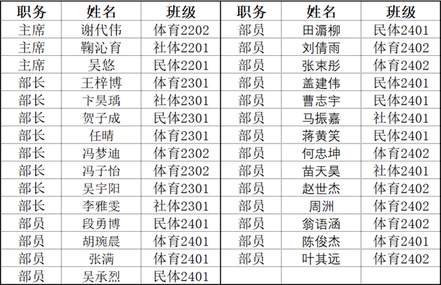负责组织和策划各类体育赛事工作,通过组织和参与院篮球赛、足球赛等体育赛事的筹备和管理工作,为同学们搭建了展现体育才能、增强团队协作的平台,同时也营造了积极健康的校园运动氛围。部长为吴宇阳、李雅雯,部员为曹志宇、马振嘉、蒋黄笑、何忠坤。