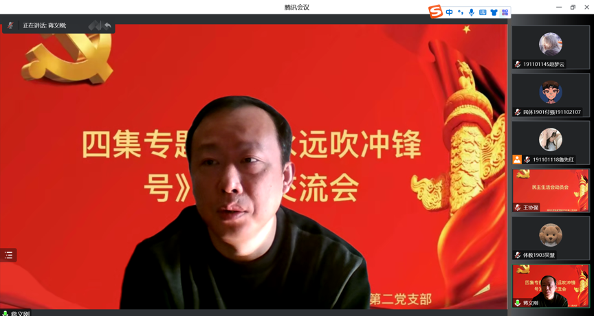 为深入推进党风廉政宣传教育工作,切实提高全体党员廉洁自律意识,筑牢拒腐防变思想防线。近日,体育学院本科生第二党支部组织全体党员观看由中央纪委国家监委宣传部与中央广播电视总台联合摄制的电视专题片《永远吹冲锋号》。1月11日上午,体育学院本科生第二党支部于线上顺利举行《永远吹冲锋号》观后交流会,会议特邀学院党委副书记蒋义刚老师,党支部书记王协强老师主持,支部全体成员参加。
