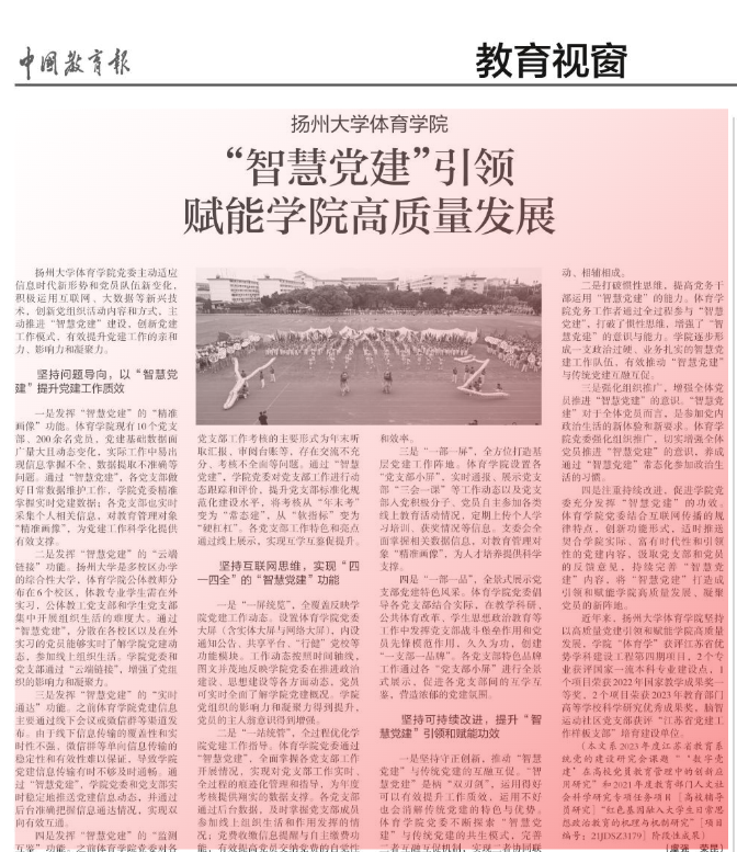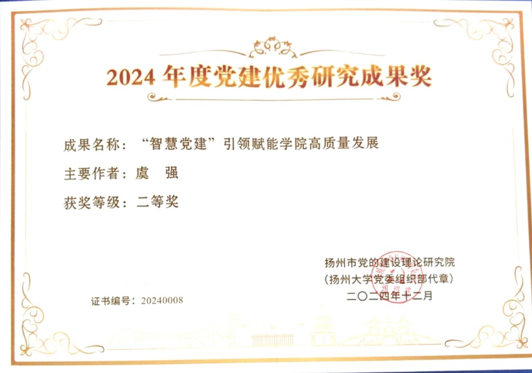 此前,项目成果《“智慧党建”引领赋能学院高质量发展》获评扬州市党的建设理论研究院2024年度党建优秀研究成果奖二等奖,《中国教育报》进行了相关报道。