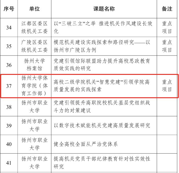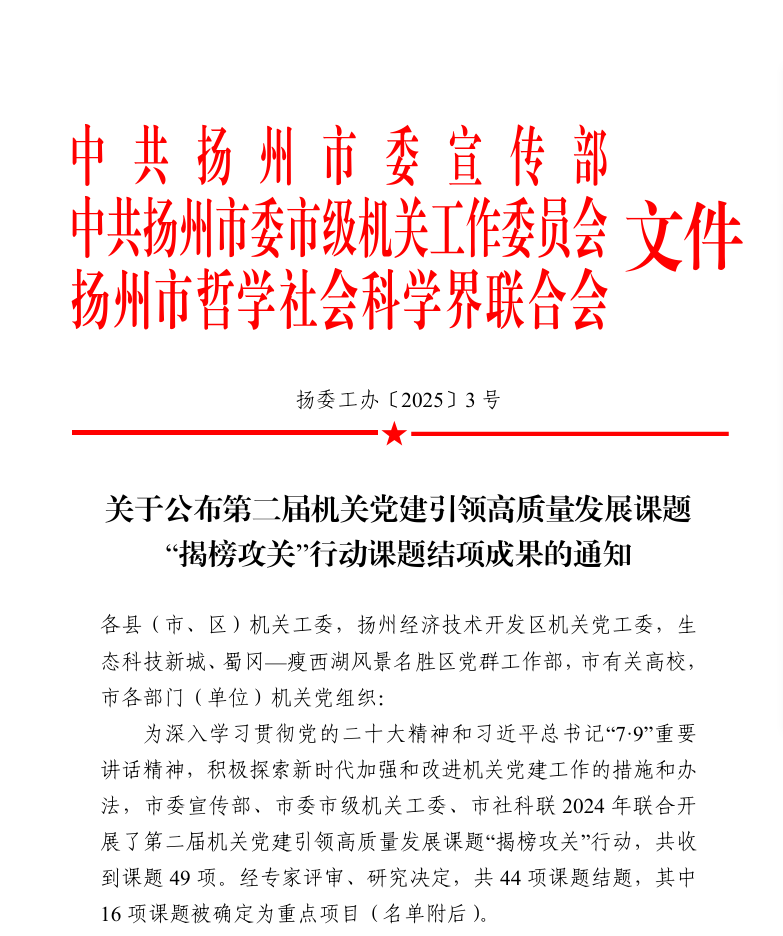 日前,我院党建项目《高校二级学院机关“智慧党建”引领学院高质量发展的实践探索》通过扬州市机关党建引领高质量发展课题“揭榜攻关”行动课题结项,并被确定为“重点课题”。