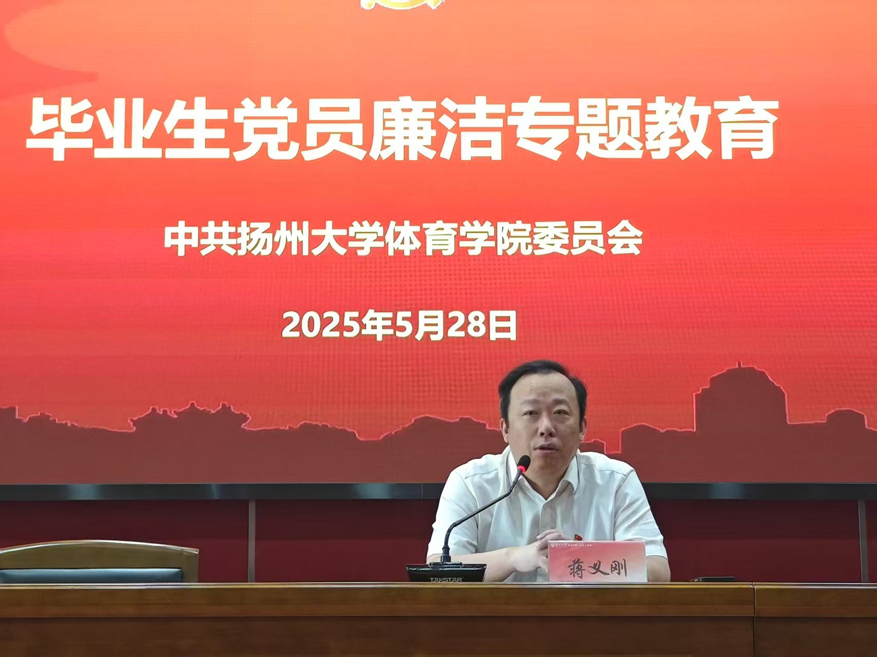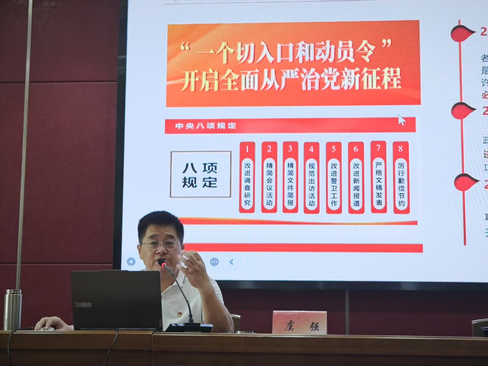 虞强以深入贯彻中央八项规定精神学习教育为主线,从“‘小切口’推动‘大变局’,持续释放将作风建设进行到底强烈信号”、“‘单体’带动‘系统’,正确把握中央八项规定精神内容及内涵”、“‘学习教育’驱动‘长效机制’,以永远在路上的坚韧执着推进作风建设”三个方面作了深刻的阐释。他勉励毕业生党员,要始终保持“严”的主基调,弘扬“实”的好作风,恪守“廉”的硬要求,加强党性修养和自我锻炼,践行教育家精神,发扬钉钉子精神,以敬畏之心绘就人生发展新蓝图,争做清正廉洁的体育工作者,为“体育强国”建设贡献智慧和力量。