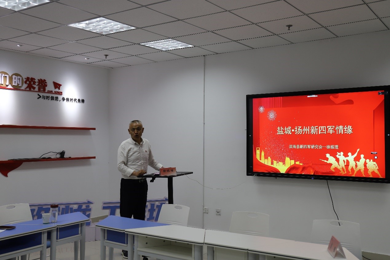 我院省级样板党支部创建单位脑智运动社区党支部与中共滨海县新四军研究会党支部为共建单位。徐振理为脑智运动社区党支部全体党员上了一堂生动的党课。徐振理会长从“盐城•扬州新四军情缘”和“滨海八路军新四军情缘”说起,结合珍贵史料,深情讲述了新四军在盐阜地区艰苦卓绝的斗争史和军民鱼水情的感人故事,激励师生党员从革命历史中汲取精神滋养,坚定理想信念,弘扬“听党指挥铁的信仰、报国为民铁的担当、逆境制胜铁的意志、集中统一铁的纪律”的铁军精神。